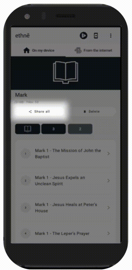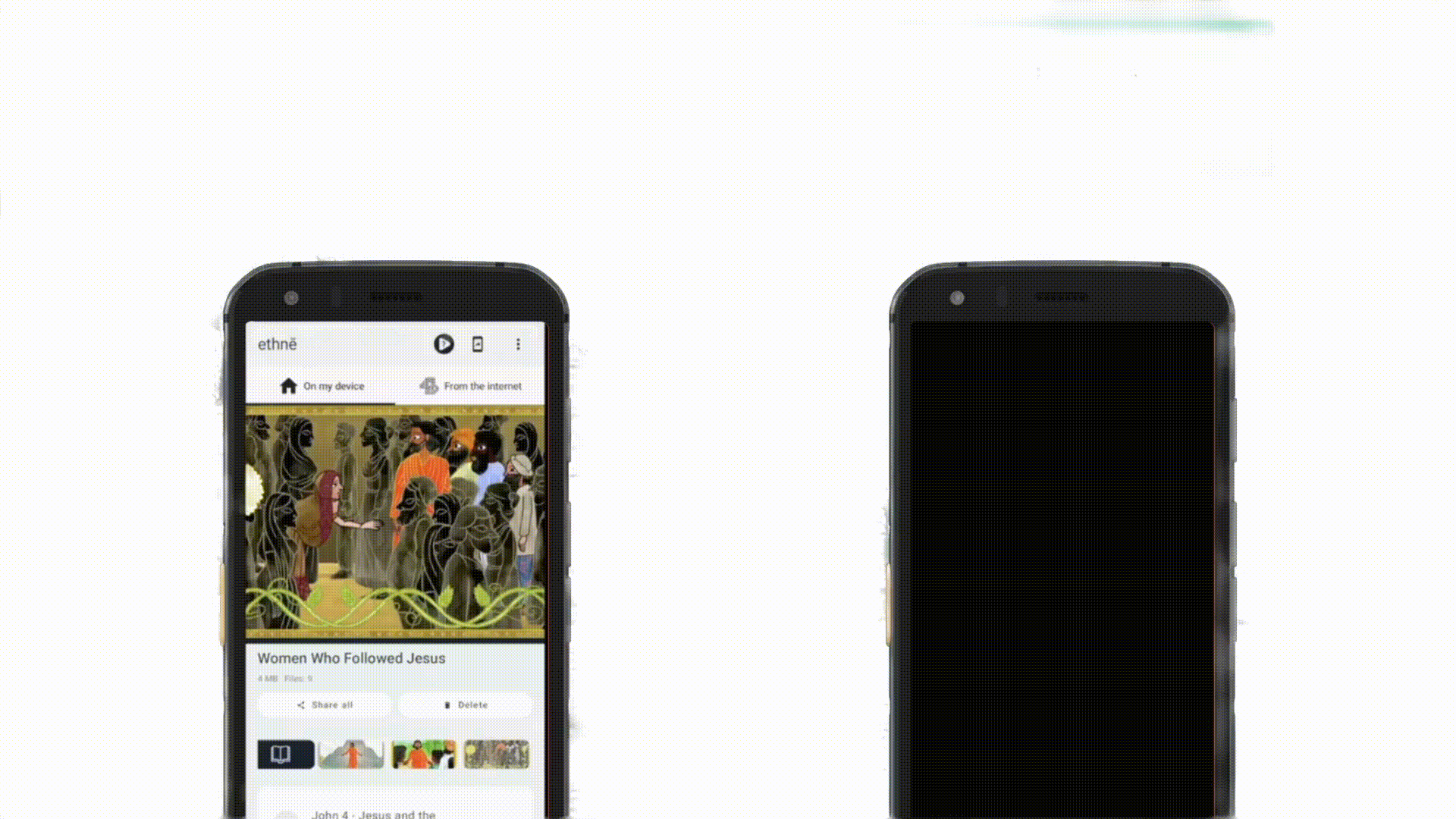 Many people might have a smartphone, but they cannot afford a data plan to download an entire audio Bible. Let's say we are in the same room and we both have an app from The Discipleship Platform. In this example, I have the New Testament Audio, and you do not. We both open our apps, and I can share the audio from the New Testament from my app to yours at Wi-Fi speeds without touching the Internet.